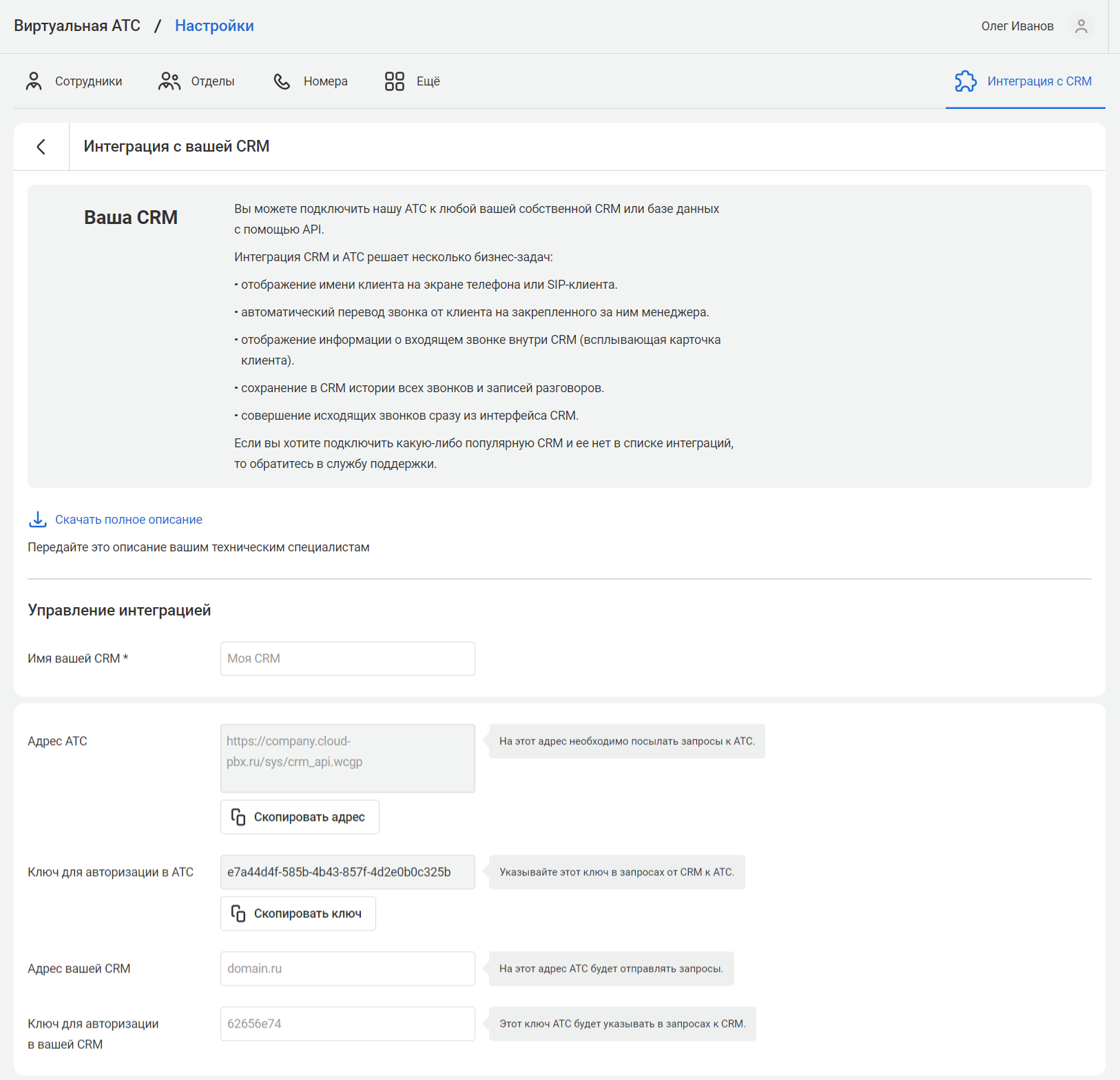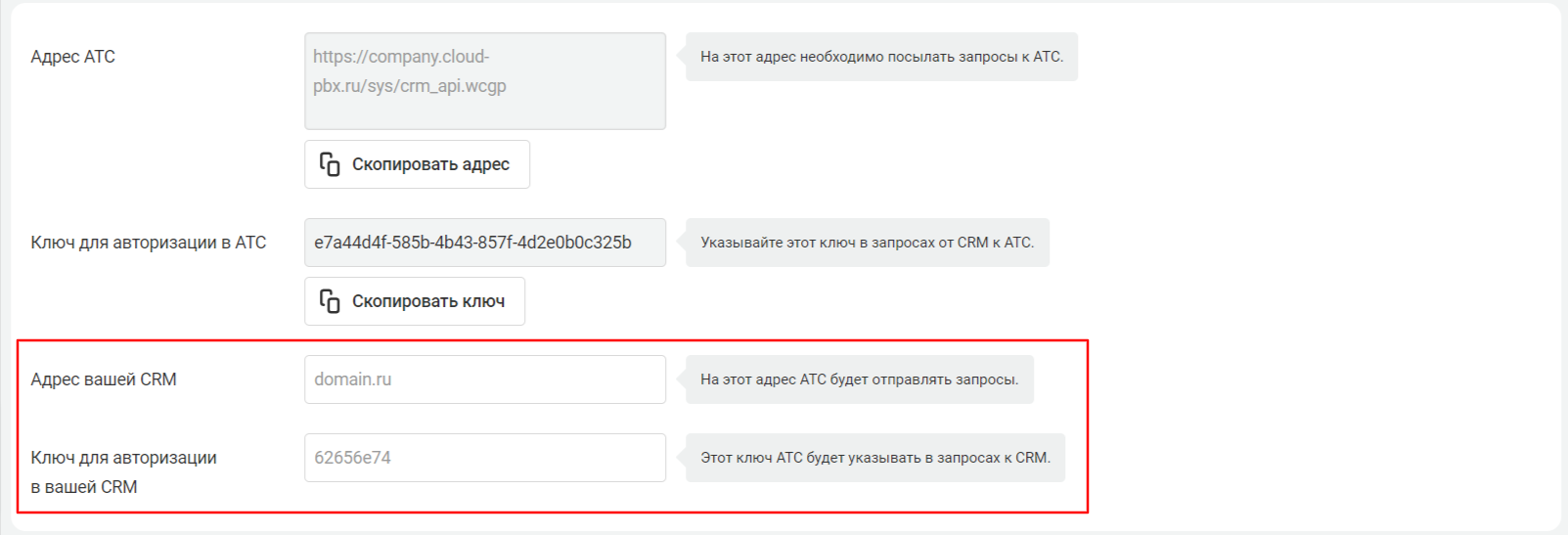 • Ключ для авторизации в CRM: вводим произвольный ключ который будет совпадать с таким же параметром в личном кабинете АТС