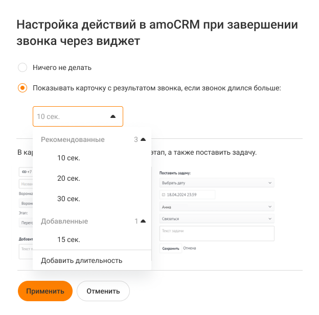 По умолчанию карточка всплывает после звонков длительностью больше 30 секунд, чтобы сотрудники заполняли результаты только по релевантным вызовам. Но если у вас немало коротких звонков — например, для подтверждения записи на услугу — вы можете поменять эту настройку.