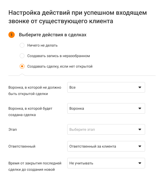 • Воронки, в которых АТС будет проверять наличие открытых сделок по позвонившему клиенту, чтобы исключить дубли.