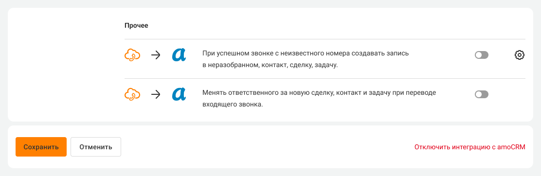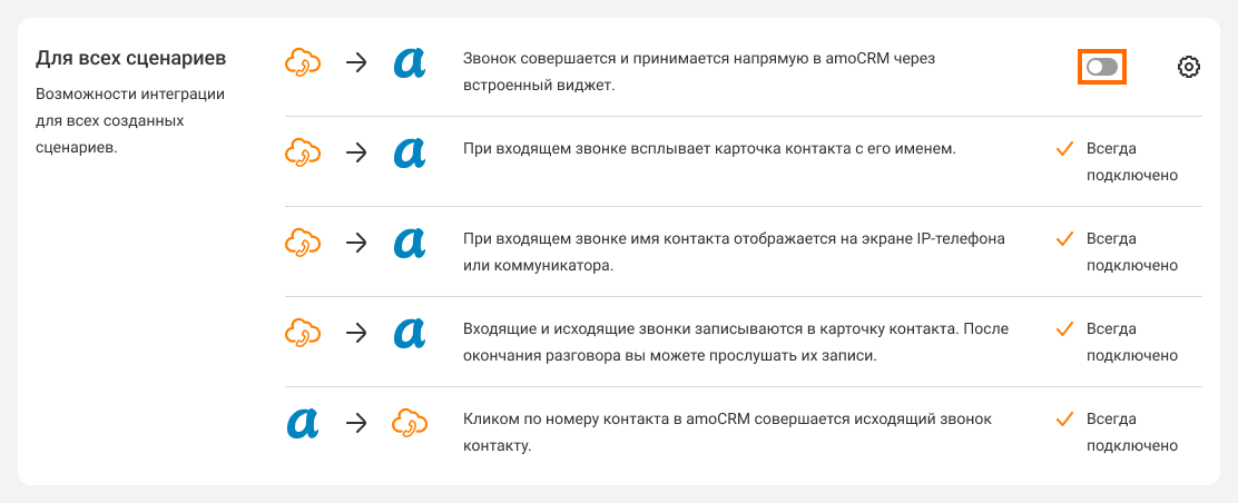 Чтобы принимать звонки в amoCRM через встроенный виджет, передвиньте переключатель в первой строчке вправо Подробнее о звонках через виджет в amoCRM читайте в этой статье.