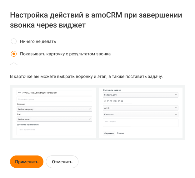 Чтобы по завершении вызова в amoCRM всегда отображалась карточка с результатами звонками, в открывшемся окне выберите «Показывать карточку с результатом звонка».