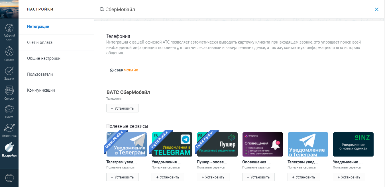 2. Чтобы найти виджет нужного вам оператора в интерфейсе вашей amoCRM введите название оператора в поле поиска или перейдите в amoМаркет, далее – «Телефония» и найдите в списке нужную вам интеграцию. Нажмите «Установить бесплатно».
