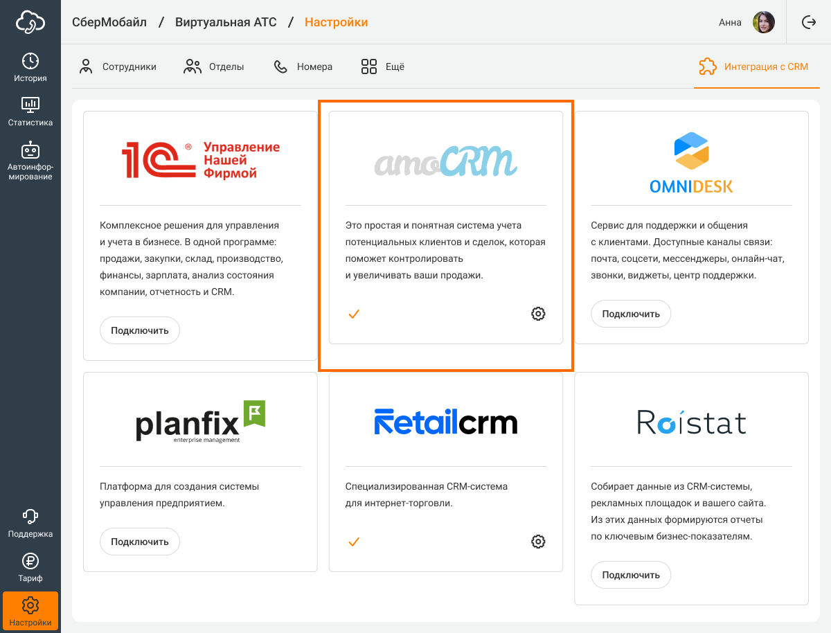 После того, как вы настроите все необходимые сценарии, начинайте пользоваться интеграцией amoCRM с АТС.
