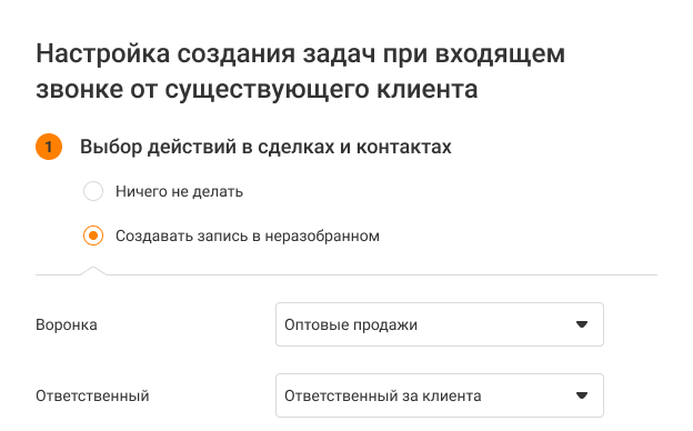 В настройках записей в неразобранном вы можете выбрать воронку и ответственного: сотрудника, принявшего звонок или ответственного за клиента.