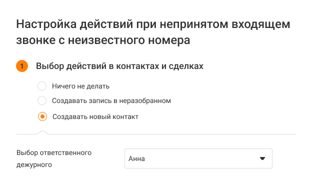 При входящих звонках с неизвестного номера в amoCRM могут автоматически создаваться контакты. Чтобы отрабатывать пропущенные звонки с неизвестных номеров, в настройках сценария интеграции также можно выбрать дежурного, ответственного за перезвон по этим номерам.