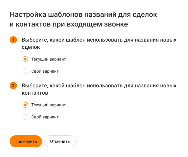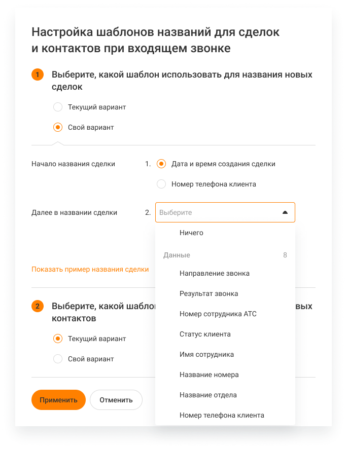 3. В меню ниже выберите, с чего будет начинаться название сделки при входящем звонке: дата и время создания сделки или номер телефона клиента. По этим параметрам проще всего отличить одну сделку от другой.