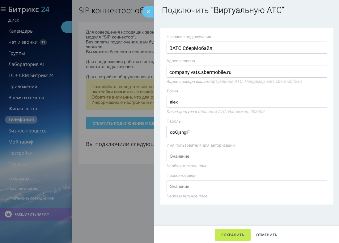 • Адрес сервера – адрес вашей Виртуальной АТС (например, vats.sbermobile.ru);