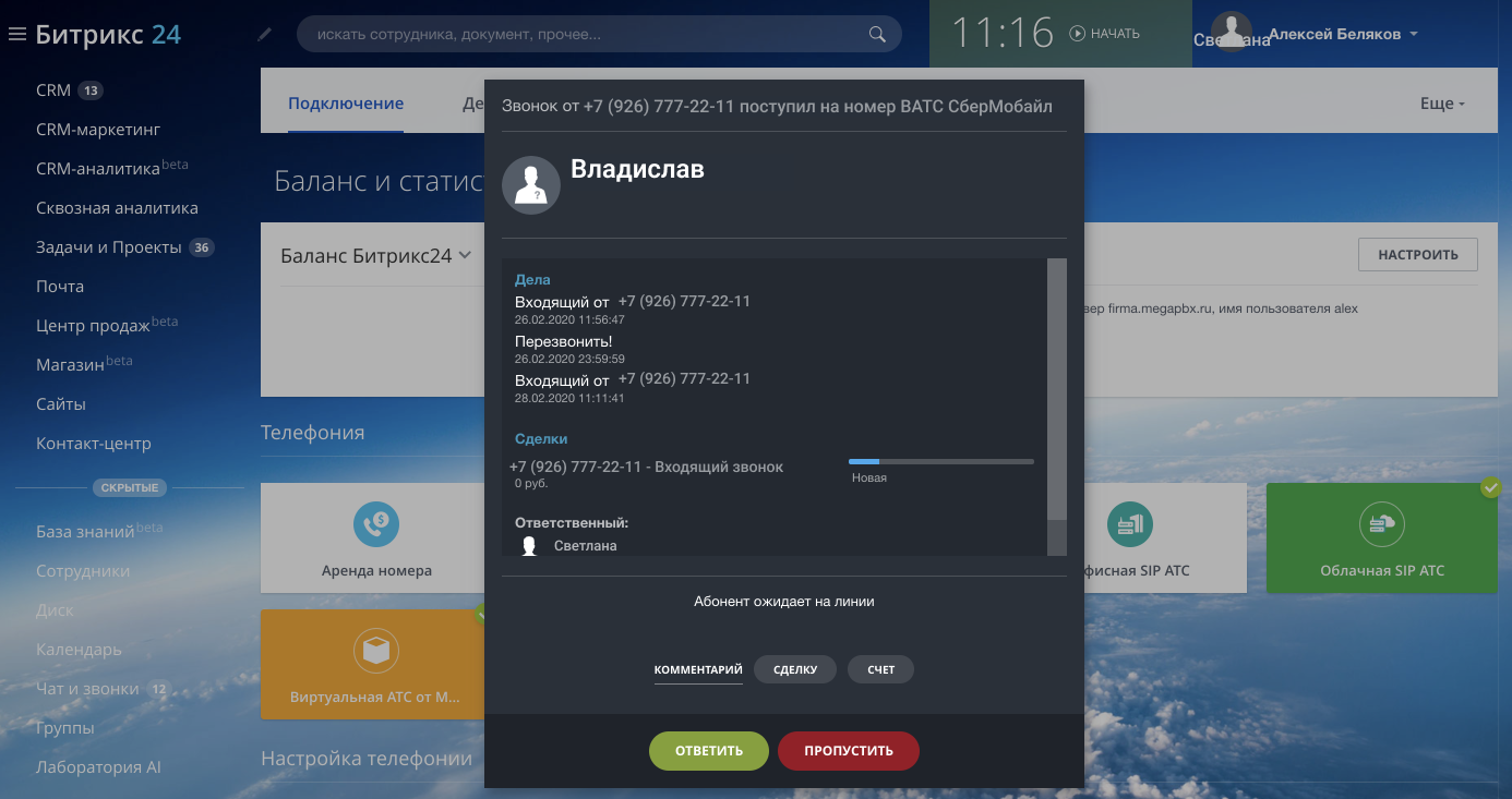 Есть еще один способ интеграции Виртуальной АТС и Битрикс24. Стандартная интеграция работает через виджет Виртуальной АТС наиболее корректно и обеспечивает всем необходимым функционалом. Однако в Битрикс24 имеется встроенная телефония, которая в том числе позволяет подключить сторонние Виртуальные АТС.