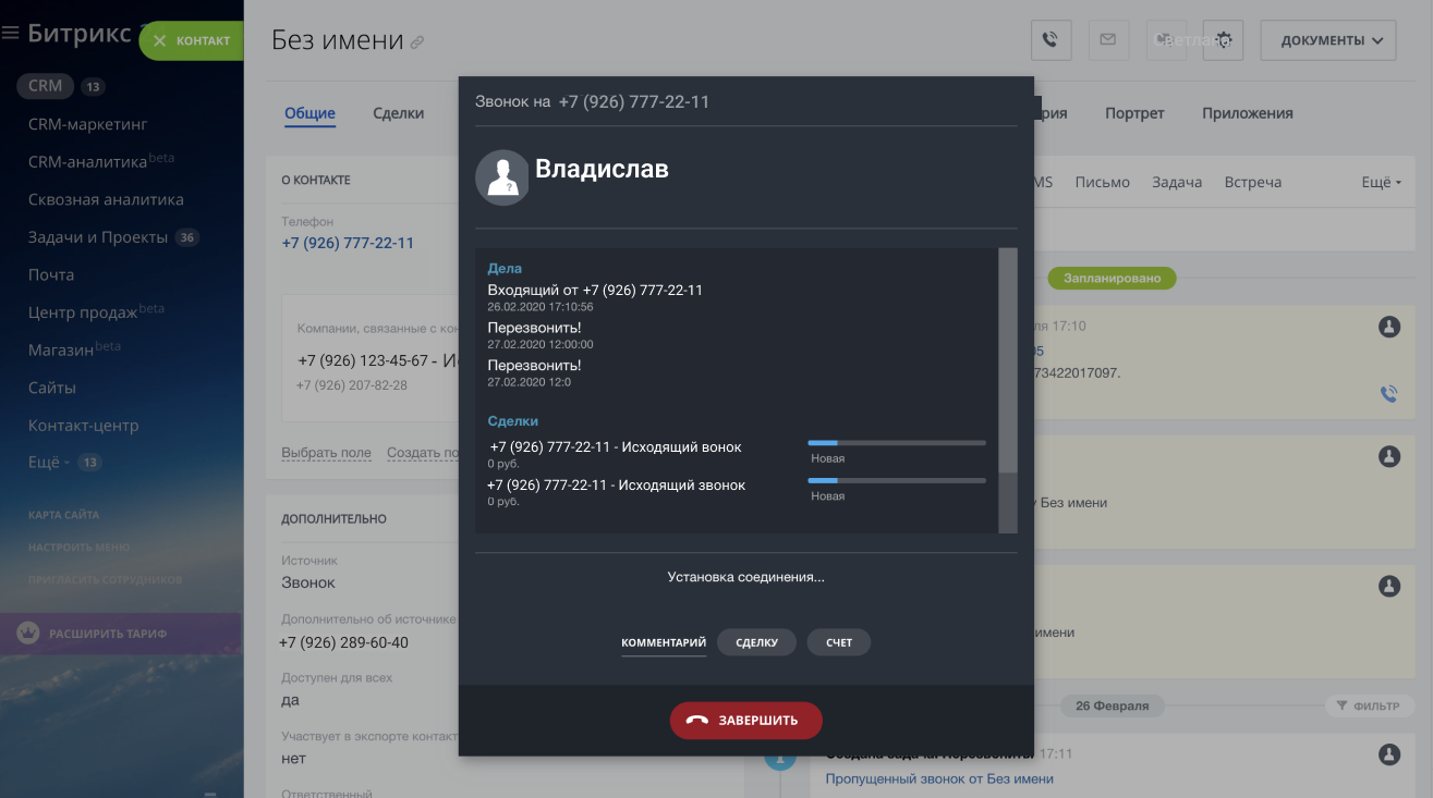 Для совершения исходящего вызова нужно нажать на номер телефона, во время вызова откроется окно