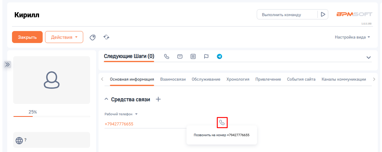 • В карточке контакта в блоке «Средства связи» нажать на иконку трубки.