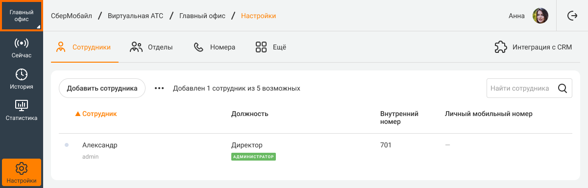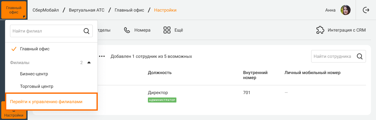 3. Доступы: можно предоставлять доступы к администрированию или только просмотру филиалов. Открывайте доступ сотрудникам с логином АТС или создавайте администраторов и руководителей филиалов с нуля.