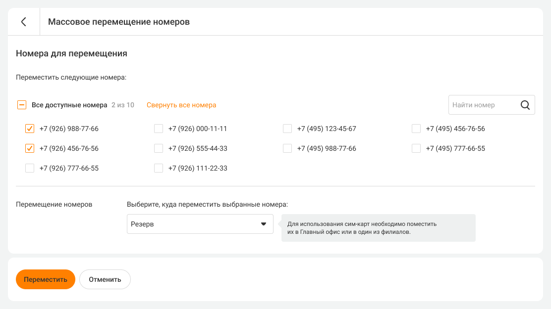 В разделе «Номера» можно перенести сразу несколько номеров в один филиал или в резерв. Чтобы это сделать, выполните следующие шаги: