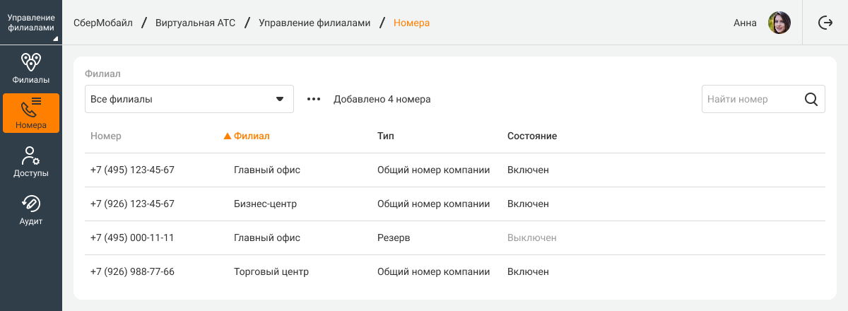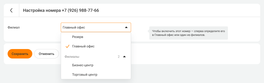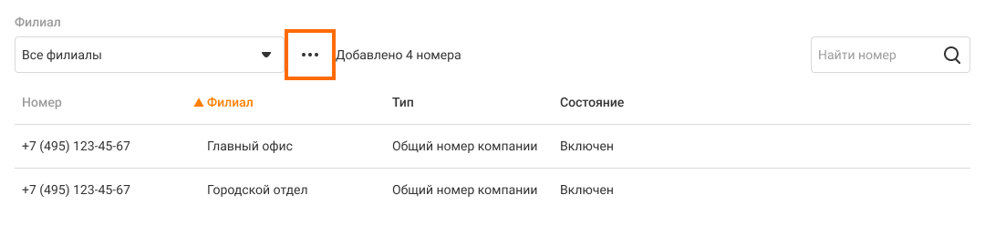 • Состояние – выключен или включен. Номер можно выключить в настройках номеров внутри филиала или в кабинете управления филиалами, если добавить его в резерв.
