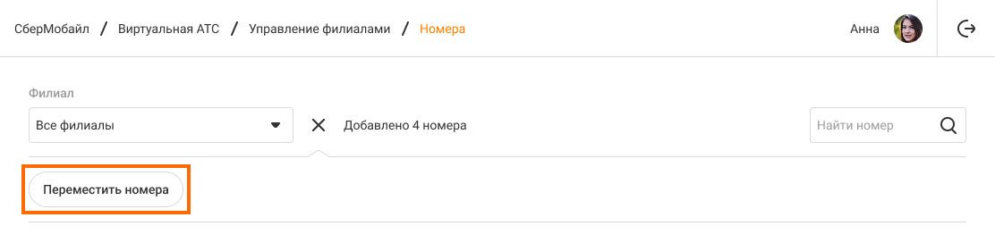4. Нажмите на кнопку «Переместить». Теперь выбранные номера относятся к указанному филиалу.