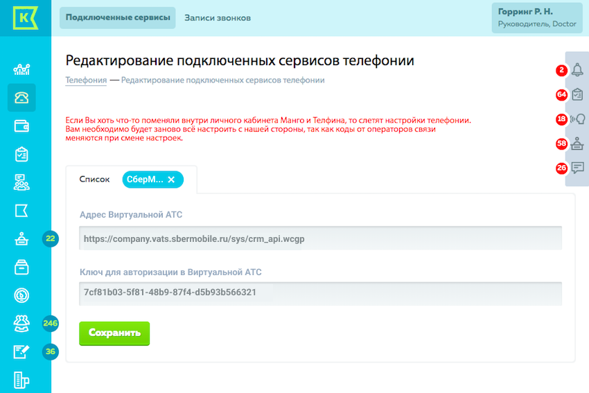 3. В настройках CRM зайдите в «Телефония» — «Подключенные сервисы». Нажмите «Добавить сервис» Введите адрес АТС и ключ для авторизации, нажмите «Сохранить».
