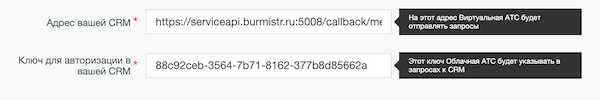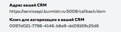 Скопируйте адрес CRM и ключ в настройки интеграции в ВАТС.