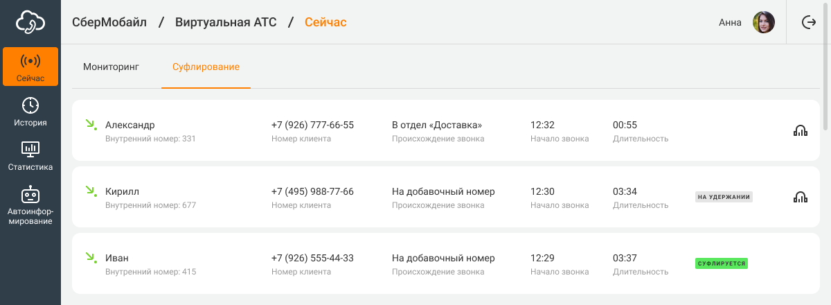 В ВАТС видны все активные звонки компании. Во вкладке «Суфлирование» по каждому вызову отображается время начала разговора и его длительность. Иконка наушников справа показывает, что к вызову можно подключиться. Также здесь отображается происхождение каждого звонка — исходящий он или входящий. Про входящие звонки можно узнать, куда именно позвонил клиент.