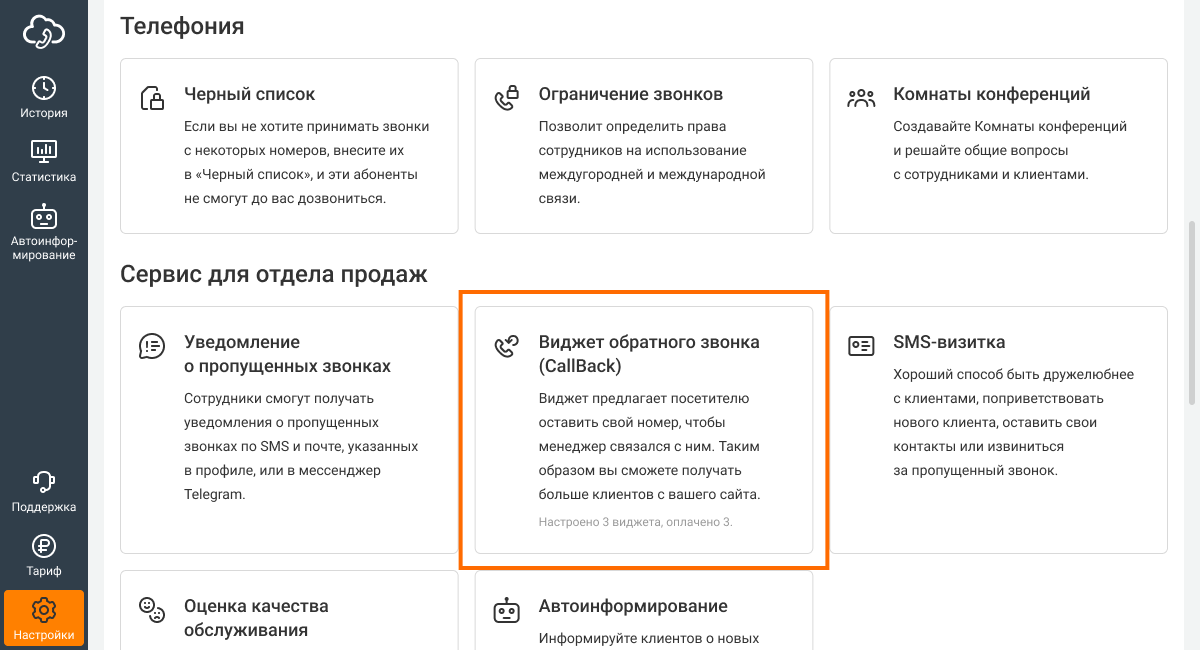 1. Зайдите в настройки, перейдите в раздел «Еще» и найдите там опцию «Виджет обратного звонка (CallBack)».