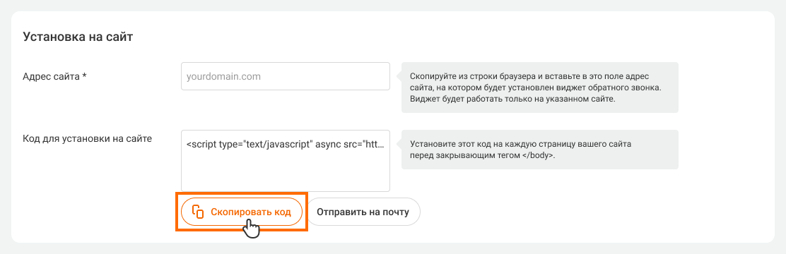10. Скопируйте код для установки виджета на сайт и отправьте его своему веб-мастеру. Также вы можете самостоятельно вставьте код на ваш сайт (место, куда нужно установить код, указано в комментариях к полю «Код для установки на сайт» в личном кабинете).