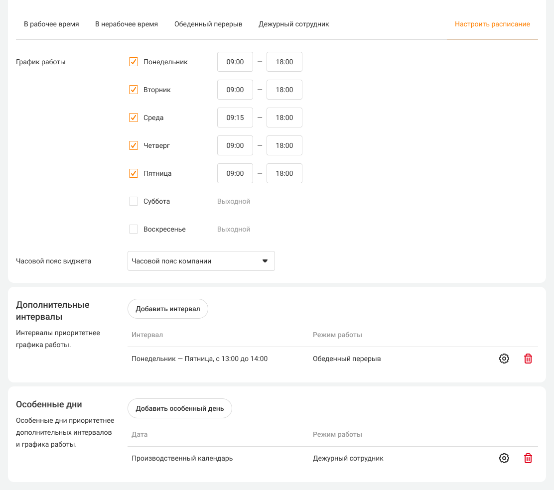 5. Если ваша компания работает по производственному календарю, с перерывами на обед или другими особенностями расписания, вы можете учесть это в настройках виджета. Нажмите «Настроить расписание».
