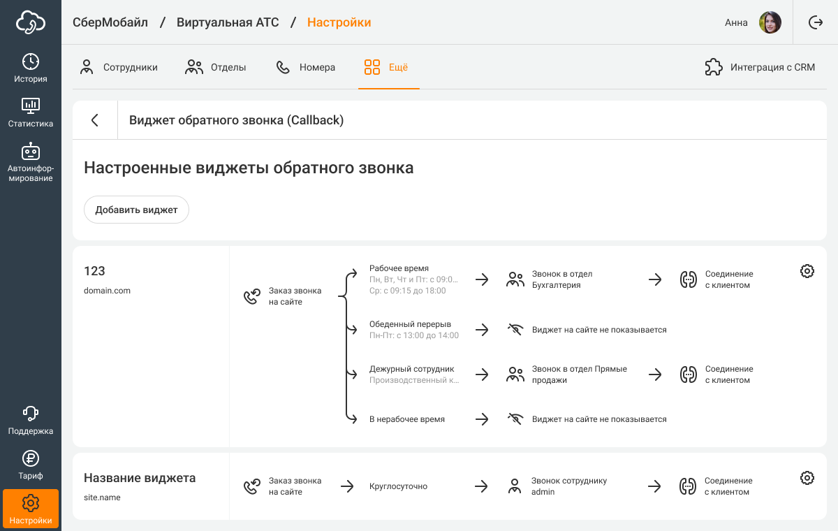 11. Сохраните изменения. По схеме приема звонков проверьте, что верно настроили расписание виджета. Подготовьте ваших сотрудников принимать звонки, заказанные через виджет.