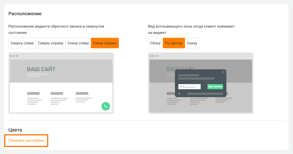 - Выберите, в каком углу сайта будет располагаться виджет обратного звонка в свернутом состоянии.