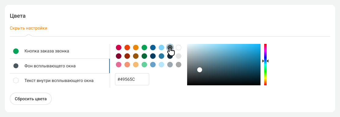 Выберите цвет кнопки заказа звонка, фона всплывающего окна и текста внутри него. Вы можете подобрать цвета таким образом, чтобы они соответствовали вашему фирменному стилю или сделали виджет еще заметнее на страницах вашего сайта.