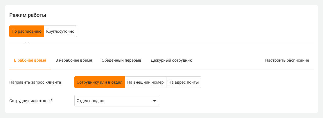 3. Укажите расписание, по которому ваши менеджеры принимают звонки в рабочее и нерабочее время. Выберите сотрудников или отделы, которые будут отвечать на звонки, заказанные через виджет обратного звонка с сайта.