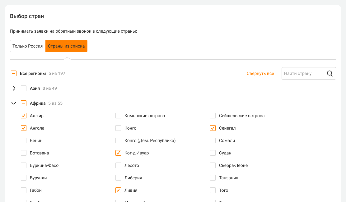6. Укажите, клиенты из каких стран могут оставить заявку на обратный звонок с вашего сайта. Если обратный звонок попытается заказать пользователь из страны, не входящей в зону обслуживания вашей компании, Виртуальная АТС сообщит об этом, как только клиент введет номер телефона в виджете.