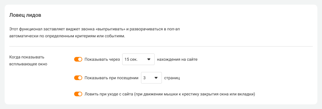7. Настройте функцию «Ловец лидов», чтобы всплывающее окно с предложением заказать обратный звонок с сайта появлялось автоматически: когда посетитель находится на сайте дольше определённого времени, просмотрел уже несколько страниц или хочет уйти с сайта.