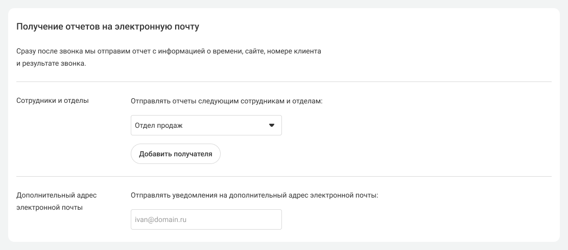8. Вы можете получать отчеты о каждом звонке, заказанном с помощью виджета обратного звонка с сайта. Для этого выберите, кому из сотрудников (или отделов) Виртуальная АТС будет отправлять эти отчеты.