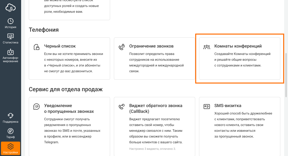1. В настройках Виртуальной АТС нажмите кнопку «Еще», и в разделе «Телефония» кликните на «Комнаты конференций».