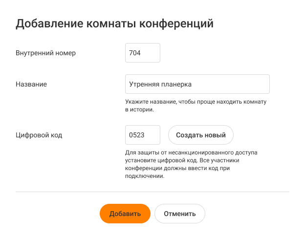 3. Придумайте название конференции и внутренний номер (адрес) комнаты. Он поможет участникам быстро присоединиться к встрече.