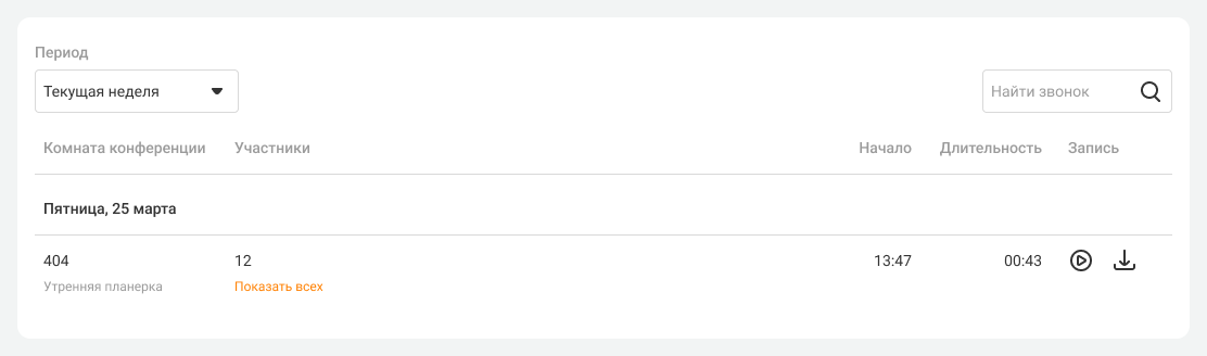 Найти нужную конференцию можно по названию комнаты и дате, а также отфильтровав список конференций по имени участника или номеру телефона. Вы можете не только прослушать запись конференции, но и скачать ее, чтобы отправить коллегам.