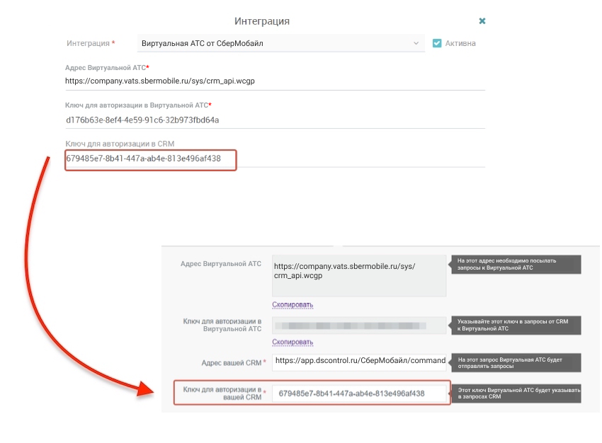 Скопируйте значение полей «Адрес вашей CRM» и «Ключ для авторизации в CRM» из Автошкола-Контроль и вставьте их в соответствующие поля в Личном кабинете АТС: