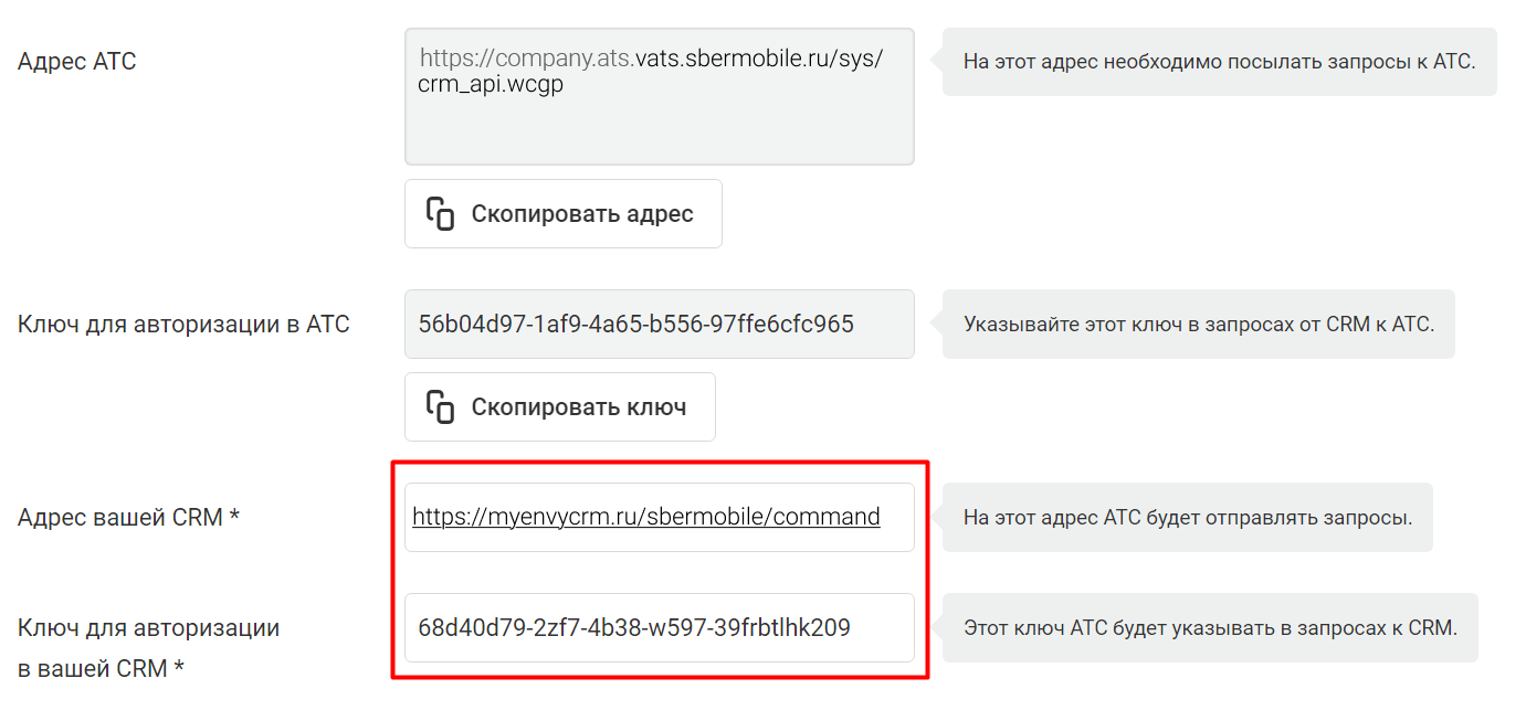 Далее в настройках CRM-системы нажмите «Генерировать», скопируйте сгенерированный ключ и вставьте его в поле «Ключ для авторизации в вашей CRM» в личном кабинете Виртуальной АТС.