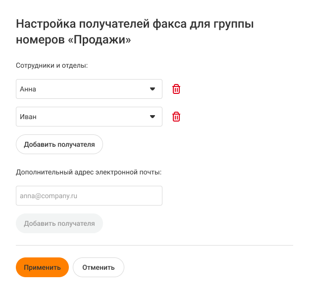 Чтобы удалить настройки факса номера, в блоке «Получатели факса» нажмите на корзину справа от этого номера.