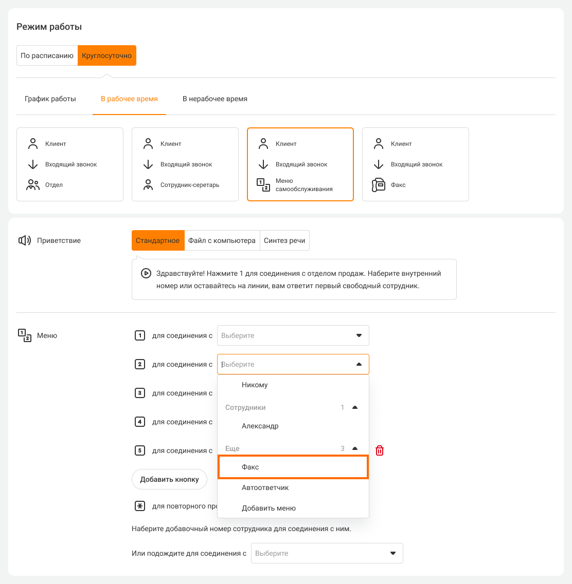 Выберите режим работы «Круглосуточно» и вариант распределения звонков на «Голосовое меню». Назначьте факс на одну из кнопок голосового меню.