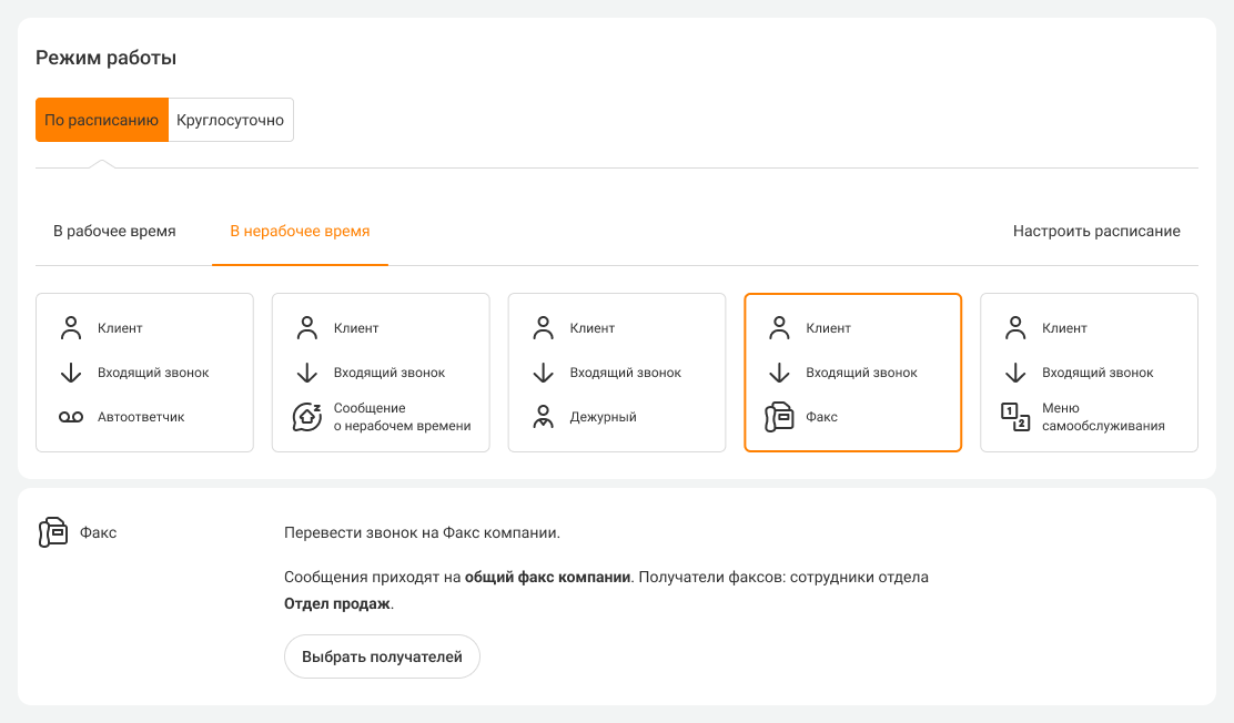 В разделе «Номера» выберите режим работы «По расписанию» и во вкладке «В нерабочее время» выберите перевод входящего звонка на факс.