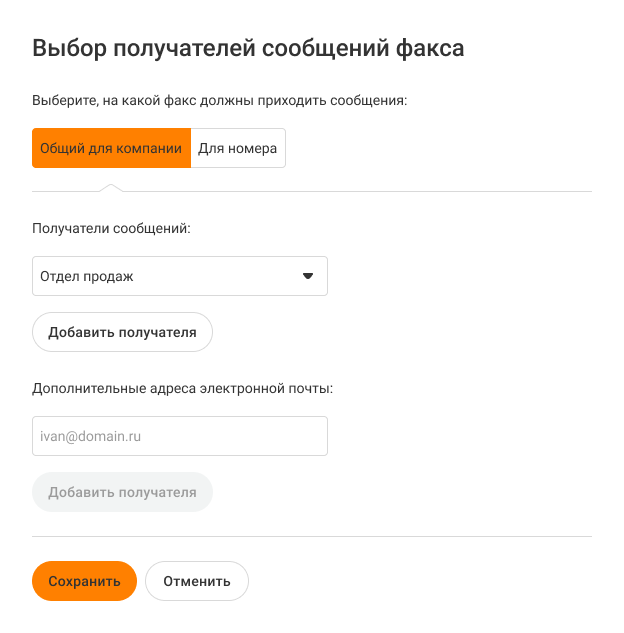 • Общий для компании — голосовые сообщения будут приходить всем получателям сообщений общего факса компании;