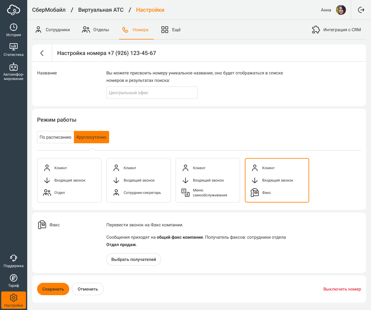 Чтобы подключить к отдельному номеру на постоянной основе, перейдите в раздел «Номера». Выберите режим работы «Круглосуточно» и настройте один из номеров для работы с факсом.