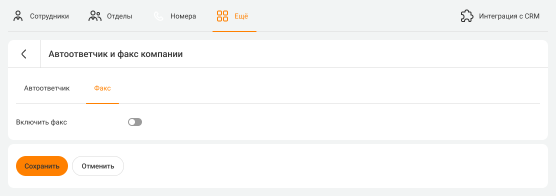 Чтобы посмотреть настройки всех факсов компании, перейдите в «Настройки» – «Еще» – «Автоответчик и факс компании» – вкладка «Факс».