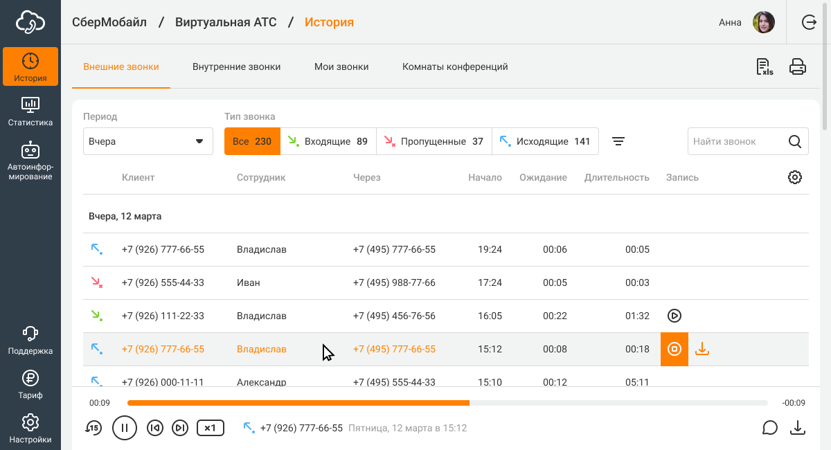 С таким отображением столбца «Сотрудник» вы можете контролировать работу секретарей и администраторов — отфильтровать и прослушать все звонки, которые они приняли, чтобы удостовериться, что эти сотрудники соблюдают стандарты общения в компании.