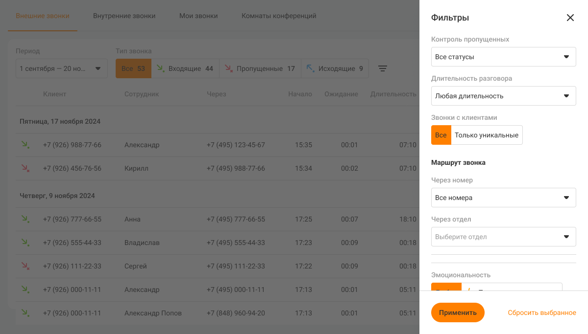 Откроется боковая панель с фильтрами. Выберите нужные вам значения фильтров и нажмите «Применить». В таблице останутся только те звонки, которые соответствуют заданным вами параметрам.