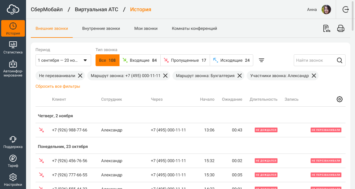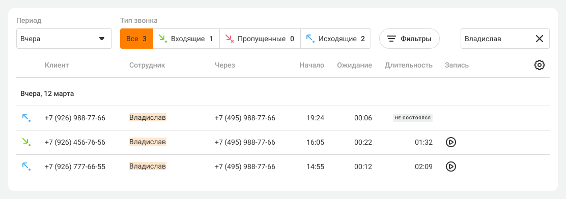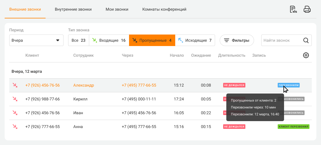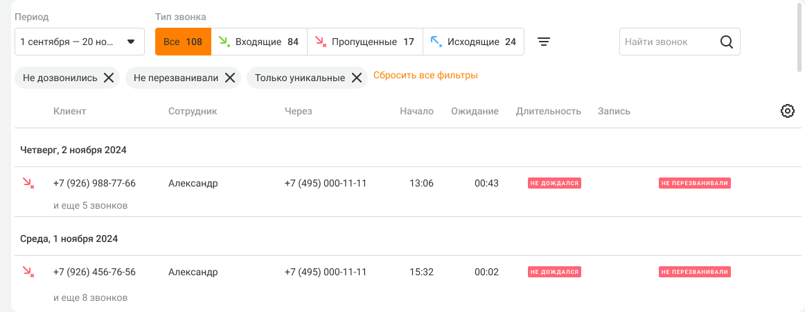 Благодаря фильтру «Контроль пропущенных» вы сможете легко найти непринятые звонки, на которые сотрудники не перезванивали или не дозвонились.