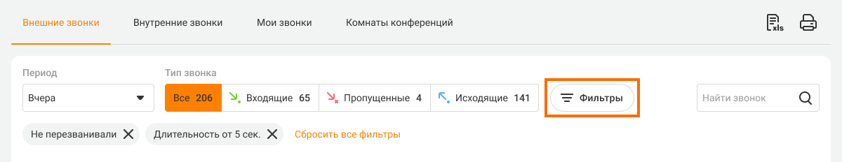 Чтобы вы в любой момент видели, по какому принципу выполнена сортировка звонков, выбранные значения фильтров закрепляются над таблицей звонков. Каждый заданный вами параметр – в отдельной серой плашке.