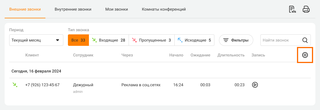 Иногда руководителю важно видеть в Истории не сотрудника, который завершил звонок, а того, кто его принял. По умолчанию в столбце отображается тот, кто завершил звонок. Чтобы изменить эту настройку, нажмите на шестеренку под строкой поиска.