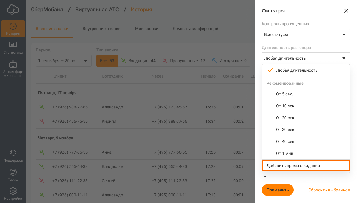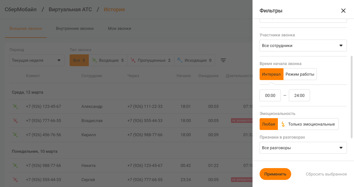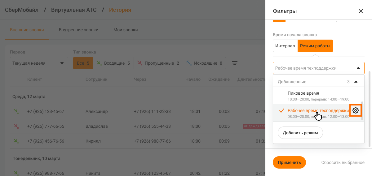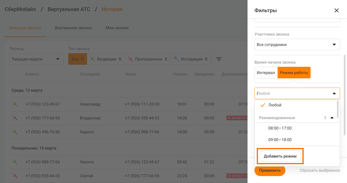 После настройки фильтра нажмите «Применить» внизу боковой панели с фильтрами. В Истории будут показаны звонки, которые начались во время выбранного режима работы.