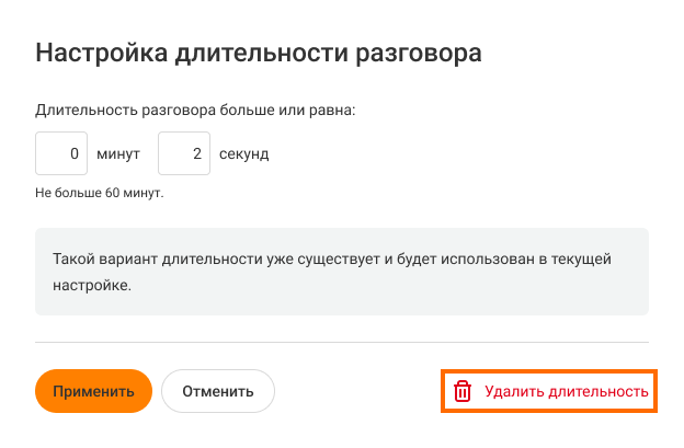 Чтобы изменить или удалить добавленную длительность разговора, в фильтре «Длительность разговора» наведите курсор на нужное значение и нажмите на шестеренку справа от времени.