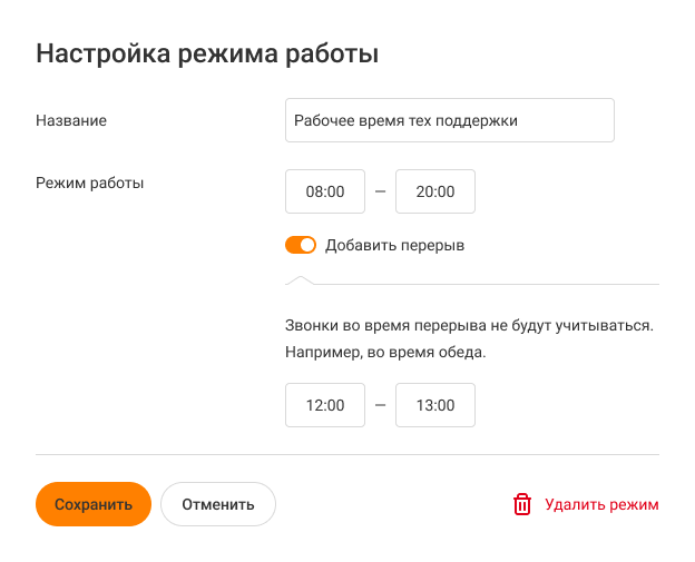 Также можно указать перерыв на обед. Для этого передвиньте вправо переключатель «Добавить перерыв» и укажите нужный интервал. Тогда при использовании фильтра фильтра «Время начала звонка» в Истории не будут показываться звонки, начавшиеся во время перерыва.